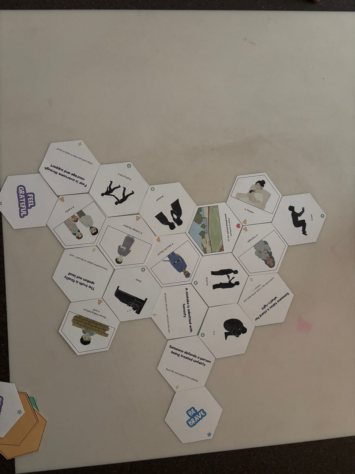 When cards form a storyline reflecting your secret Moral, reveal it, point to the card cluster expressing it, explain briefly, and win if the group agrees.