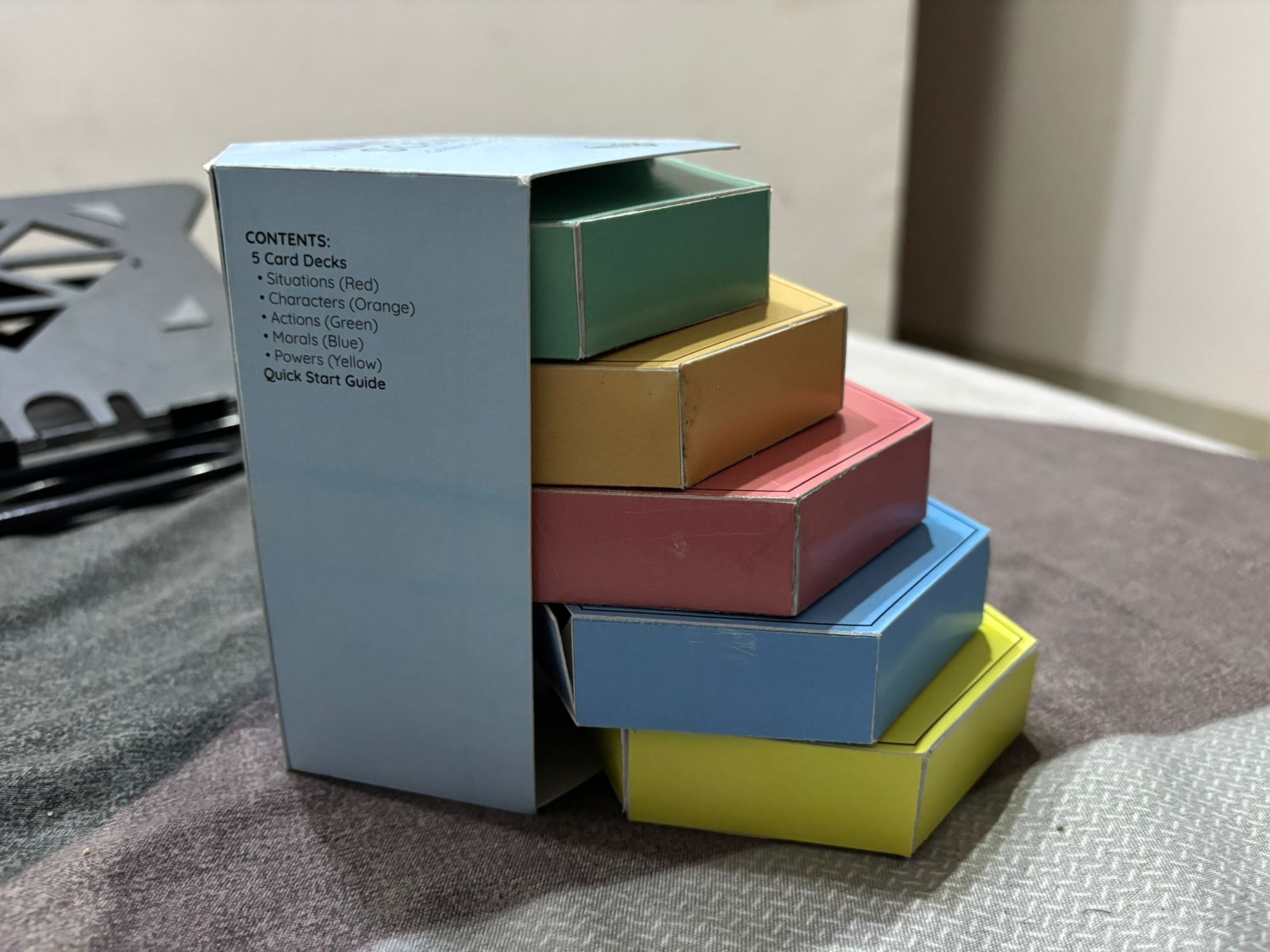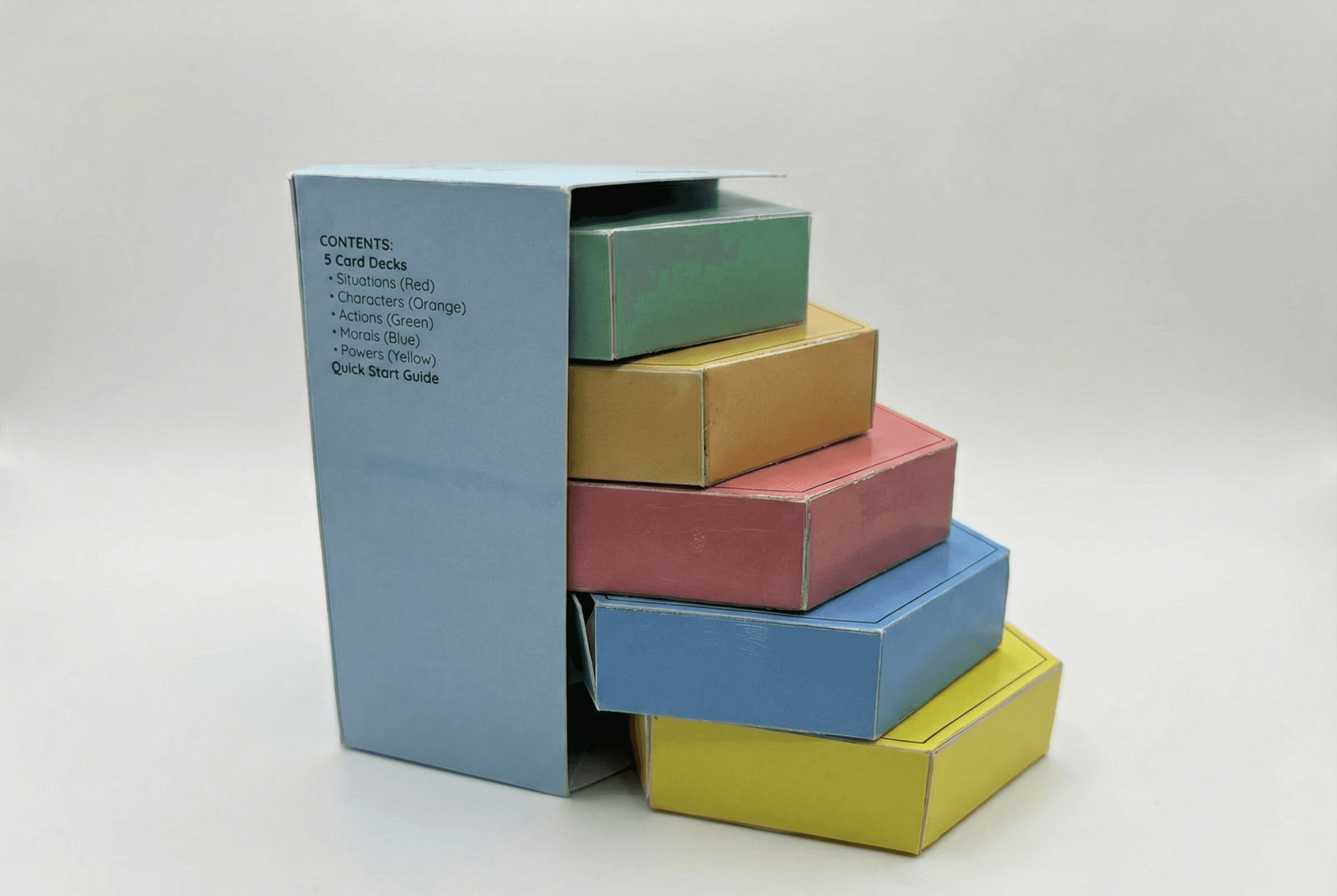 Shuffle Character and Action cards into Story Deck, Power cards into Power Deck, and Moral cards separately.